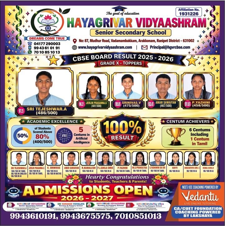 Hayagrivar is one of the best schools in Arakkonam. The school was founded in the year 2017 by Mr.K.Ravindiran, M.D and Mrs.Santhi Ravindiran, Principal with the similar intention of creating an 100% educated society. Hayagrivar Vidyaashram is an unit of well-known Sri Ramanar Vidyalaya (Matric syllabus) and it is managed by Ramana Maharishi Educational & Charitable Trust (Regd). Hayagrivar Vidyaashram is a holistic school located in Vadamampakkam village near Arakkonam town and it pursues CBSE curriculum to shape wards to compete for the emulating education system.